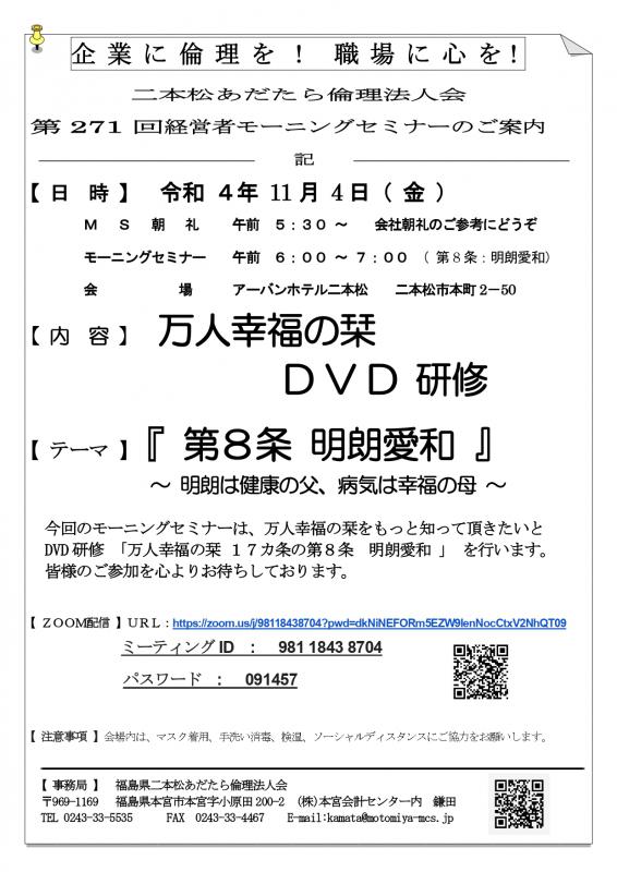 第271回 二本松あだたら倫理法人会モーニングセミナーのご案内